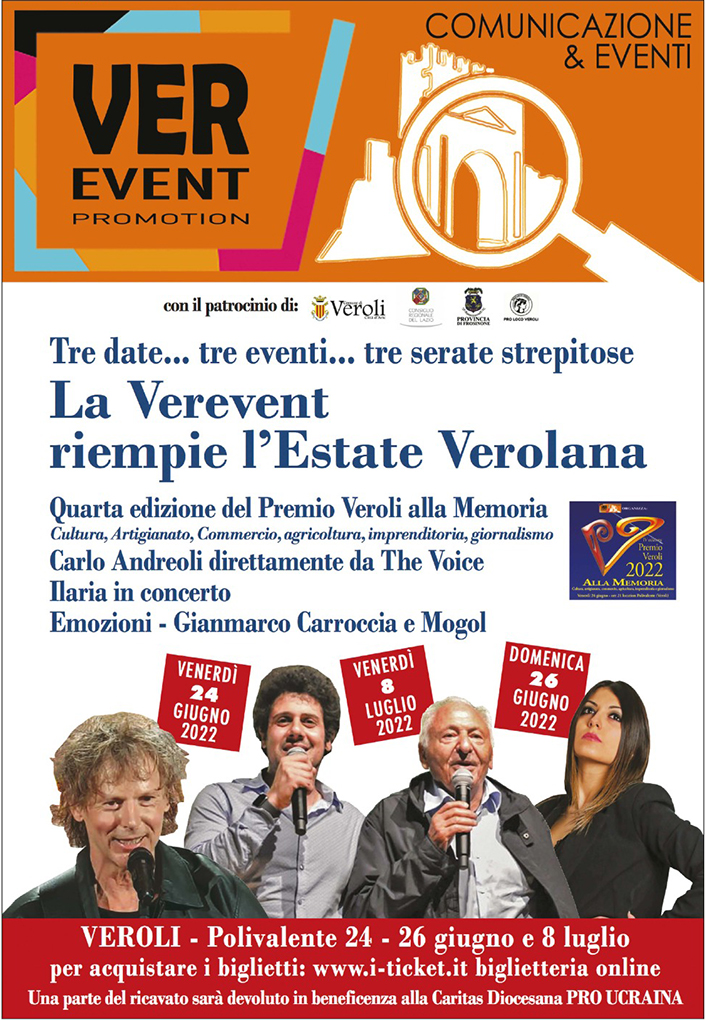 Il secondo appuntamento è con l’associazione VEREVENT di Veroli che all’impianto Polivalente di Veroli organizza venerdì 24 giugno il “PREMIO VEROLI ALLA MEMORIA – 4° Edizione”, iniziativa unica nella Regione Lazio che vede il ricordo di persone che nella loro vita si sono particolarmente distinte nei settori della cultura, dell’economia, dell’insegnamento, dello sport con premi ritirati nell’occasione dai parenti con un grande ospite d’onore, il folk singer che arriva direttamente da the voice senior Carlo Andreoli, e domenica 26 giugno, sempre al polivalente, con il concerto di ILARIA, giovanissima ed apprezzatissima cantante della nostra provincia già alla ribalta nazionale. Quest’ultimo sarà l’anticipazione dell’evento “EMOZIONI con Gianmarco Carroccia-Mogol”, un concerto che nella bellissima cornice dell’anfiteatro moderno del Polivalente, sarà il grande appuntamento proposto ed organizzato dalla VER EVENT promotion con l’erede di Lucio Battisti ed il maestro Mogol ad attirare l’attenzione dei numerosi spettatori che stanno prenotando non solo in ambito provinciale ma anche da oltre regione.