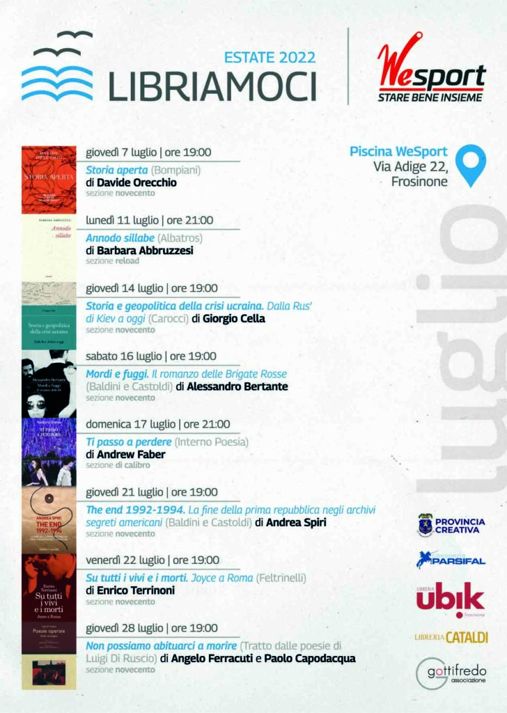 Giovedì 7 luglio, alle ore 19, si terrà il primo appuntamento di Libriamoci, la rassegna libraria che quest’estate consentirà di incontrare gli autori del momento e di avere uno spazio per riflettere insieme a loro. La piscina comunale WeSport di Frosinone ospiterà infatti la presentazione del romanzo Storia aperta (Bompiani, 2022) di Davide Orecchio.