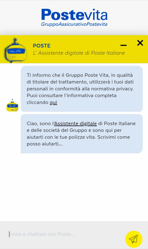 L’Assistente Digitale “Poste”, attivo 24 ore su 24 e 7 giorni su 7 inclusi i festivi sul sito di PosteVita, è un’intelligenza artificiale rappresentata da un “faccino” giallo-blu in grado di indirizzare le esigenze dei clienti intervenendo su precisi casi di assistenza anche senza richiesta esplicita del cliente, proponendo, ad esempio, il recupero delle credenziali corrette dopo due inserimenti errati.