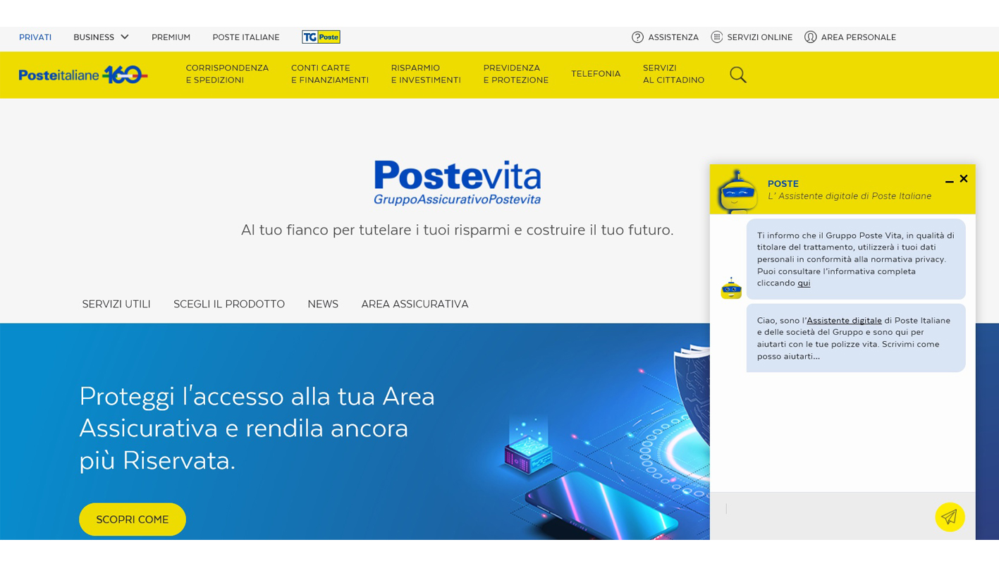 L’Assistente Digitale “Poste”, attivo 24 ore su 24 e 7 giorni su 7 inclusi i festivi sul sito di PosteVita, è un’intelligenza artificiale rappresentata da un “faccino” giallo-blu in grado di indirizzare le esigenze dei clienti intervenendo su precisi casi di assistenza anche senza richiesta esplicita del cliente, proponendo, ad esempio, il recupero delle credenziali corrette dopo due inserimenti errati.