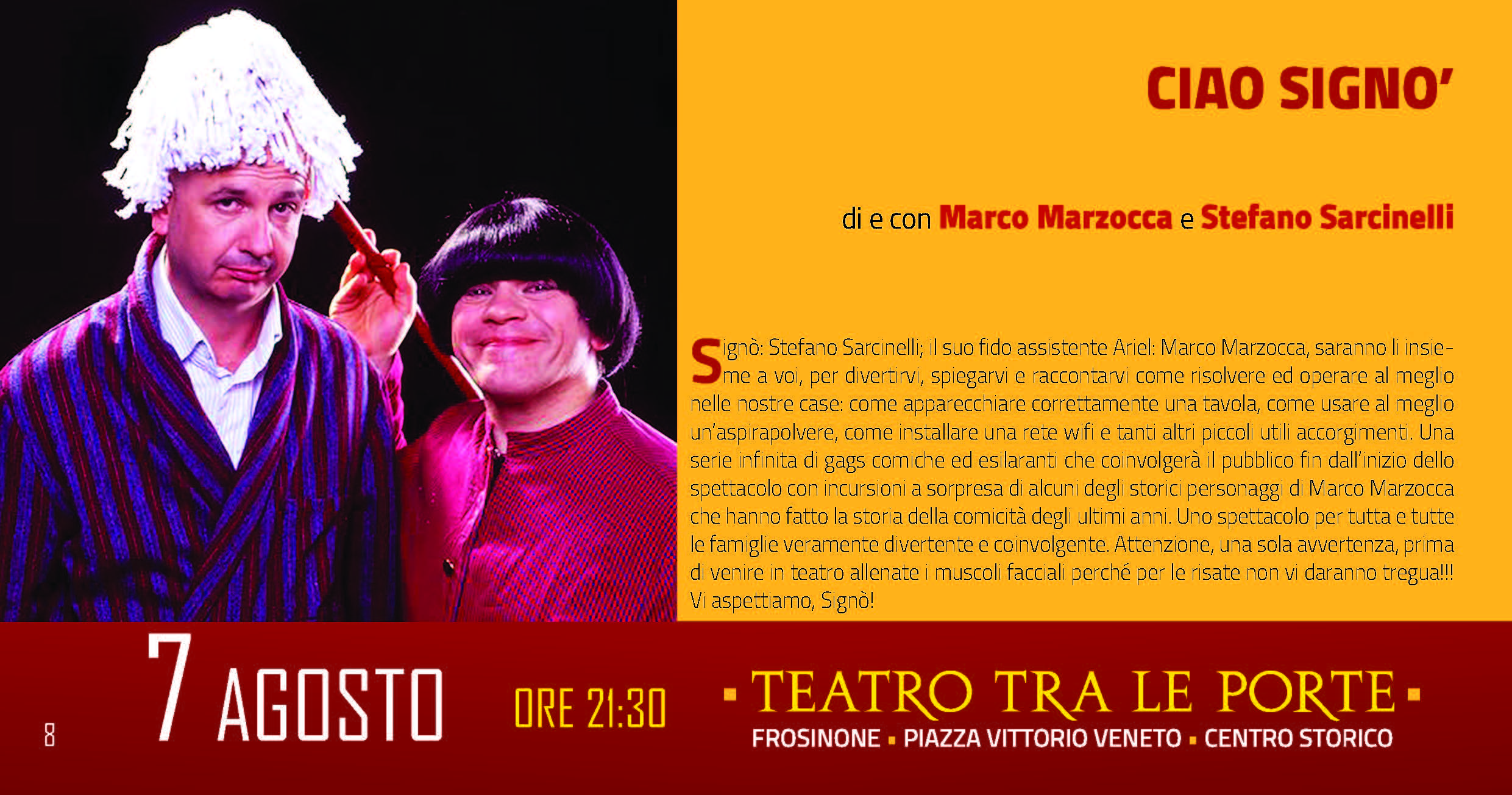 Nuovo appuntamento in programma con l’ironia, la comicità, il divertimento. Domenica 7 agosto torna, infatti, il Teatro tra le Porte, in piazzale Vittorio Veneto, alle 21.30: in scena, ““Ciao signo’”, di e con Marco Marzocca e Stefano Sarcinelli. Ingresso gratuito.