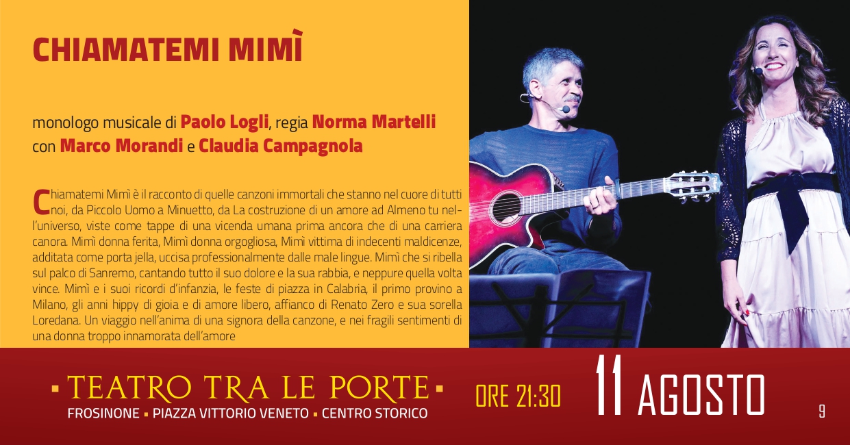 Ultimo appuntamento in programma con l’ironia, la comicità, il divertimento del Teatro tra le Porte. Giovedì 11 agosto, in piazzale Vittorio Veneto, alle 21.30, sarà di scena “Chiamatemi Mimì”, monologo musicale di Paolo Logli; regia Norma Martelli, con Marco Morandi e Claudia Campagnola. Ingresso gratuito.