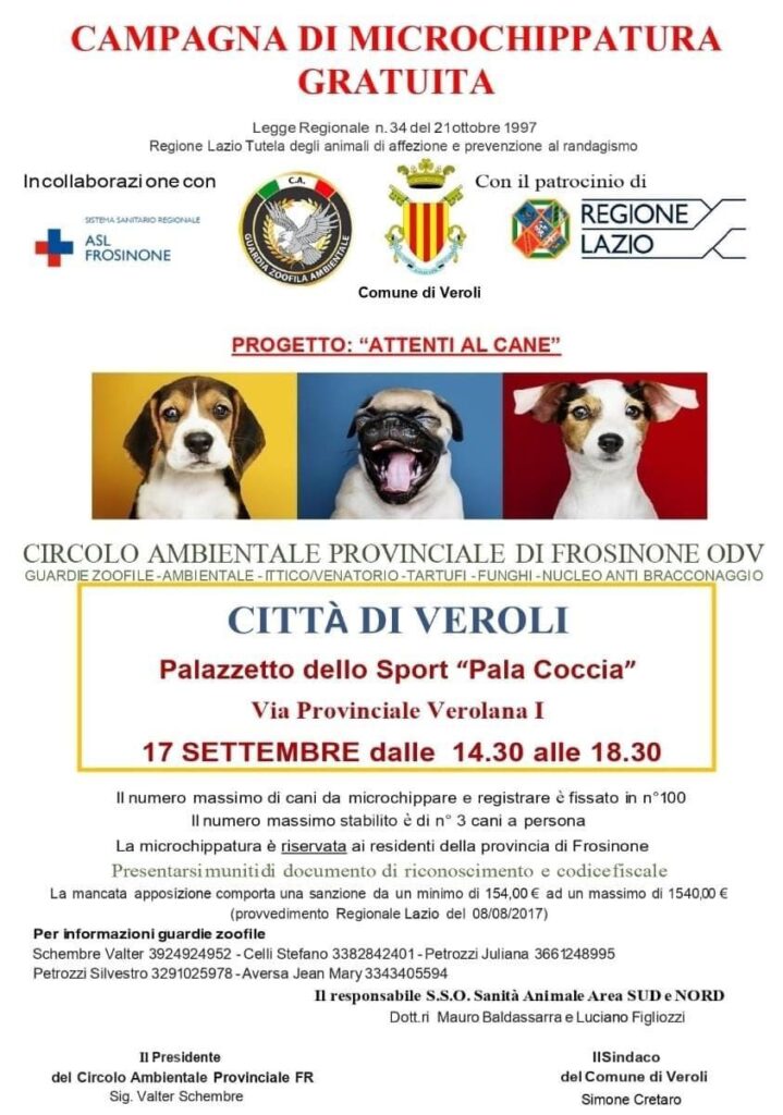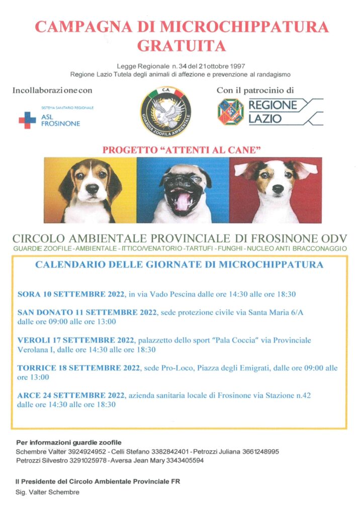 Il Circolo Ambientale Provinciale di Frosinone tramite il progetto ATTENTI AL CANE, approvato e finanziato dalla regione Lazio contro la lotta al randagismo, sta organizzando in diversi comuni della provincia di Frosinone delle giornate di microchippatura gratuita. L’impianto del microchip avverrà ad opera di veterinari professionisti dell’ASL ed è assolutamente indolore per il cane è completamente gratuito e riservato ai relativi proprietari residenti nella Provincia di Frosinone. Basta presentarsi con carta d’identità e codice fiscale, accompagnati dal vostro amico a 4 zampe.