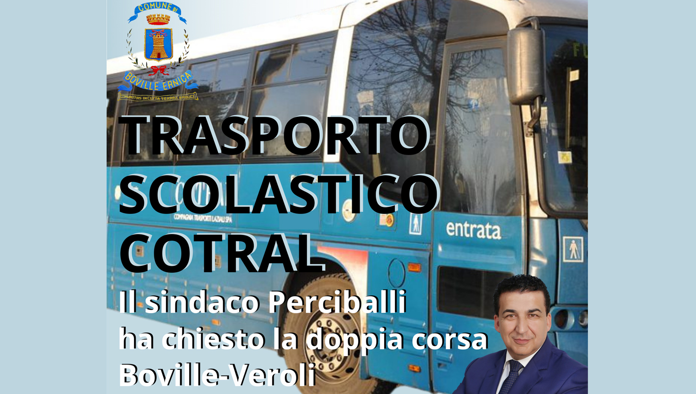 Una doppia corsa sulla linea Cotral che da Boville Ernica ogni giorno porta i ragazzi a scuola a Veroli e il pomeriggio li riporta indietro. L’ha chiesta alla Cotral, l’Azienda regionale di trasporto, il sindaco Enzo Perciballi, ottenendo rassicurazioni in merito.