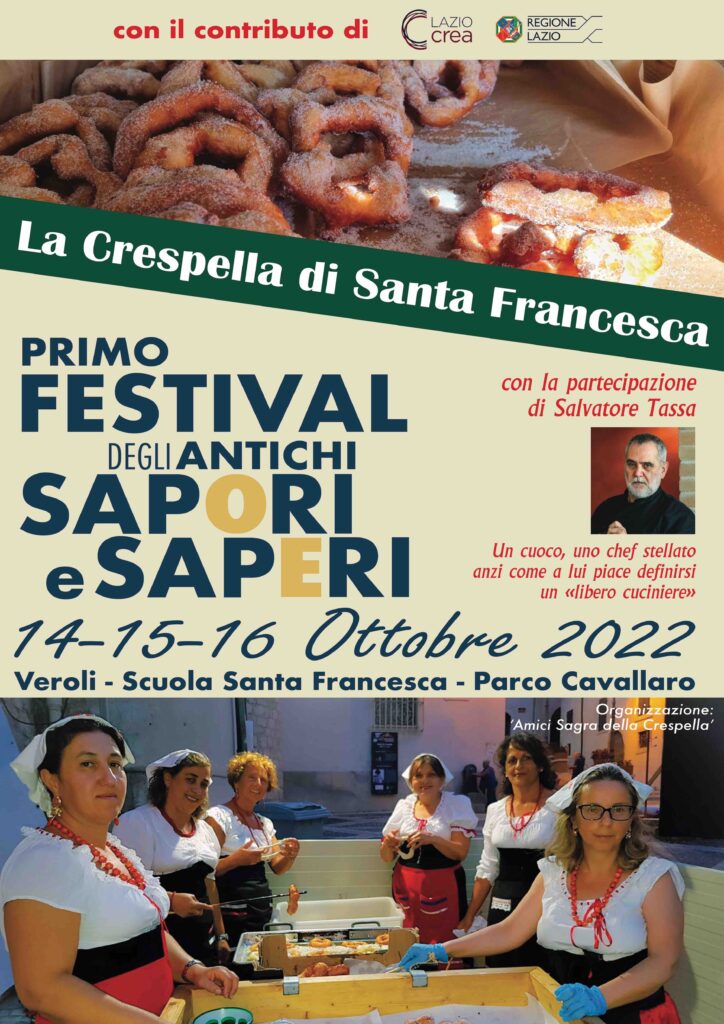 Nella popolosa contrada di Santa Francesca si sta svolgendo il ‘Primo Festival degli Antichi Sapori e Saperi – La Crespella di Santa Francesca’, organizzato dall’Associazione ‘Amici Sagra della Crespella’, si svolgerà nelle giornate del 14, 15 e 16 ottobre 2022 presso il plesso Scolastico di Santa Francesca in Veroli (FR), avrà luogo una tre giorni a carattere culturale, un progetto che punta alla valorizzazione dei mestieri e le tradizioni dei nostri avi. L’iniziativa nasce per trasmettere e tramandare alle nuove generazioni la cultura e le tradizioni che ci hanno lasciato in eredità i nostri nonni/e e padri e madri – così ci spiega il presidente An-gelo Rossi –. Per questo abbiamo scelto La Crespella di Santa Francesca, un prodotto povero e semplice realizzato con la sola acqua e farina, famosa sul territorio grazie alla prestigiosa Sagra della Crespella giunta ormai alla cinquantatreesima edizione, che si svolge come tradizione il 9 marzo». L’evento è realizzato grazie al contributo di LazioCrea Regione Lazio che ha sposato pienamente il progetto.