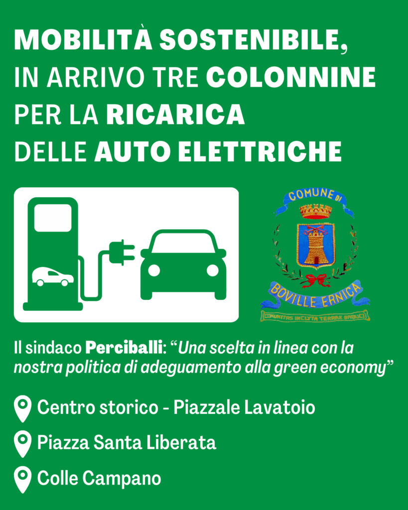 «La Giunta ha approvato la delibera che prevede l’installazione di tre colonnine per la ricarica delle auto elettriche in altrettanti punti strategici del nostro territorio comunale. Una verrà posizionata nel piazzale del Lavatoio al centro storico, una in piazza Santa Liberata e una a Colle Campano – ha detto a tal proposito il sindaco Enzo Perciballi – I punti non sono stati scelti a caso ma in modo da rispondere in modo equo alle esigenze di tutto il territorio. Così facendo non solo agevoliamo quei cittadini che hanno già un’automobile ad alimentazione elettrica ma, magari, stimoliamo anche altri cittadini a praticare una mobilità più sostenibile nel rispetto dell’ambiente circostante e che contribuisca ad abbattere le emissioni di anidrite carbonica».