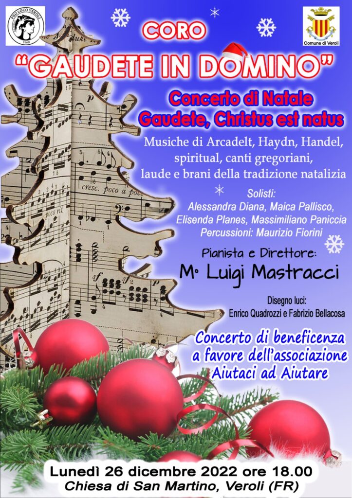 “Gaudete, Christus est natus” è il logo del concerto di Natale del Coro “Gaudete in Domino” diretto dal maestro Luigi Mastracci. L’appuntamento è per lunedì alle ore 18 nella Chiesa di San Martino. <Sarà un concerto di gioia, di speranza e direi persino di rilancio dal punto di vista artistico dopo lo stop dovuto alla pandemia. E’ quello di lunedì il primo concerto ufficiale appunto del post pandemia>– spiega il maestro – direttore Mastracci. Che tipo di concerto sarà? <Una rassegna di musica sacra dopo che a Veroli abbiamo anche organizzato con diversi cori ‘I luoghi del silenzio”. Si ripercorre attraverso la storia la nascita del Natale, un viaggio musicale che va dal gregoriano agli spirituals passando, e questa è una mia caratteristica, dalle laude medioevali alle tradizioni popolari>.