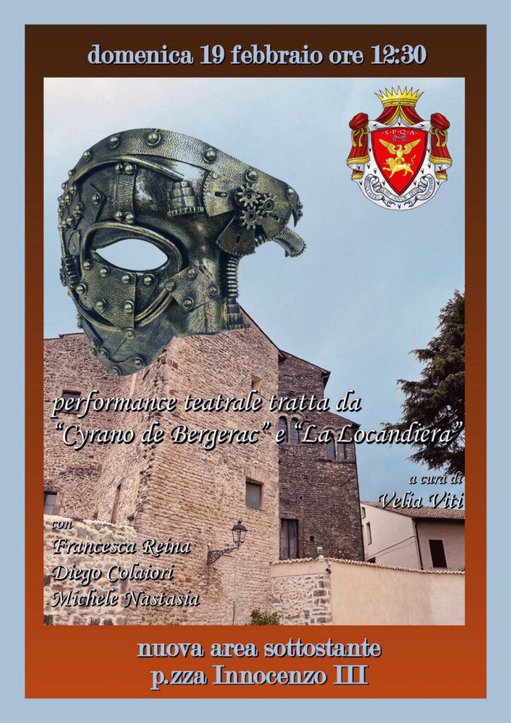Non a caso, il Comune di Anagni ha scelto proprio il teatro quale mezzo per presentare al pubblico la nuova area riqualificata sottostante Piazza Innocenzo III, domenica 19 febbraio, alle ore 12, con una performance teatrale tratta da “Cyrano de Bergerac” e “La Locandiera”, opere rispettivamente di Edmond Rostand e Carlo Goldoni, a cura di Velia Viti e con Francesca Reina, Diego Colaiori e Michele Nastasia.