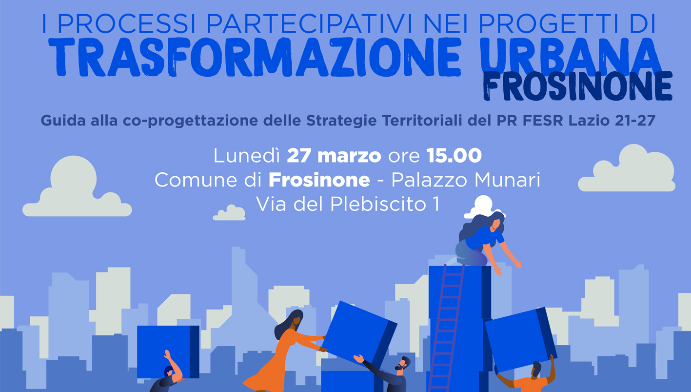 Lunedì 27 marzo, alle ore 15, presso l’aula consiliare del Comune di Frosinone, si terrà l’incontro dal titolo “I processi partecipativi nei progetti di trasformazione urbana”, nell’ambito della guida alla co-progettazione delle Strategie Territoriali del PR FESR Lazio 21-27.