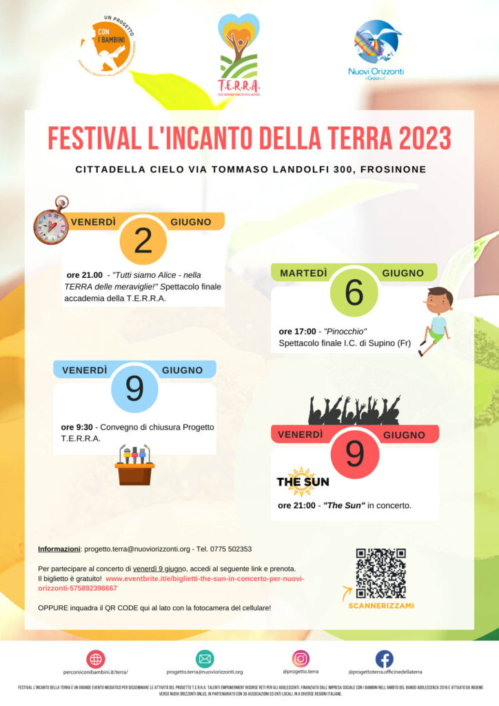 Il Progetto TERRA, avviato nel 2018 ha messo in contatto 6 regioni d’Italia, coinvolgendo attivamente più di 5000 studenti, molti dei quali nelle scuole di Frosinone e provincia. Nuovi Orizzonti, capofila del progetto insieme ad altri 32 partner coinvolti, celebrerà la fine del progetto il 9 giugno, alle ore 21 con il famoso gruppo “The Sun”, per la prima volta a Frosinone in concerto (gratuito).