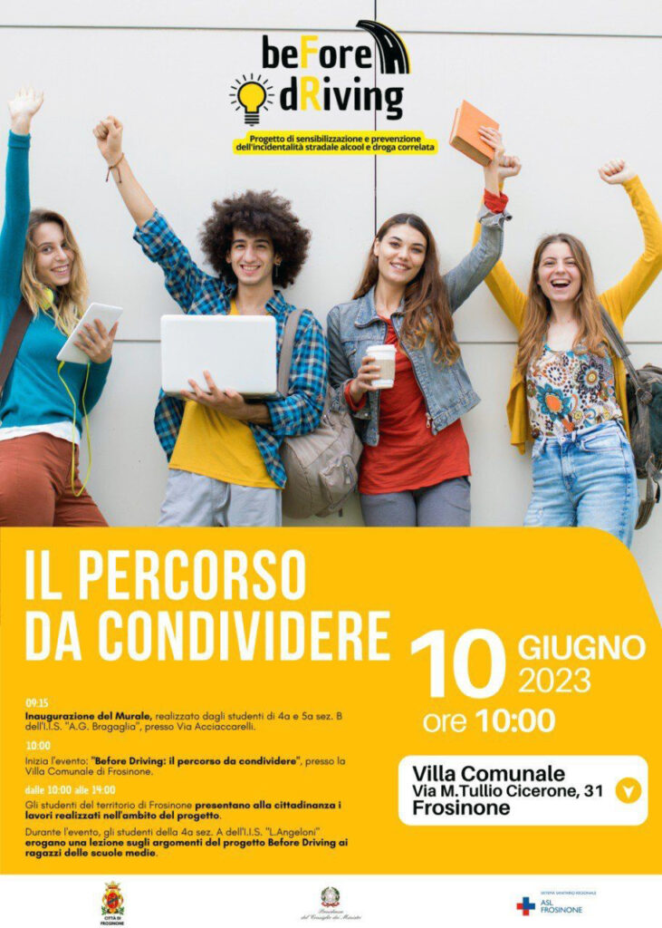 Questo il programma di sabato 10: alle 9.15 è prevista l’inaugurazione del murale realizzato dagli studenti di IV e V sezione B dell’IIS Bragaglia, presso via Acciaccarelli. Alle 10 inizierà l’evento alla Villa comunale di Frosinone che, fino alle 14, proporrà in scaletta la presentazione dei diversi progetti su cui hanno lavorato gli studenti nel corso dell’anno. Durante l’evento, le ragazze e i ragazzi della IV A dell’IIS Angeloni saliranno… in cattedra per parlare agli studenti delle scuole medie sul tema della sicurezza stradale affrontato con Before Driving.