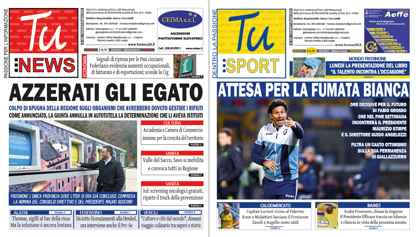 In distribuzione oggi e domani le nuove edizioni dei giornali free press della Ciociaria. “Tu News” con tanta attualità, cronaca, politica, inchiesta, cultura e spettacolo della provincia di Frosinone. E in più “Tu Sport”, dedicato al calcio, al basket, al volley, ai motori e a tutto il mondo dello sport ciociaro. Non perdete la vostra edizione cartacea reperibile nelle maggiori edicole o in bar, pasticcerie, pub, centri commerciali, palazzi istituzionali, negozi e hotel!