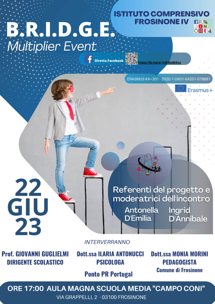 Il titolo del progetto Erasmus + “BRIDGE”, la cui traduzione in italiano è “PONTE”, è l’acronimo di “Boosting tRansition from primary to secondary Innovation by DevelopinG new Educational methods and tools”, che significa “Promuovere la transizione dalla scuola primaria a quella secondaria sviluppando nuovi metodi e strumenti educativi”. Si tratta del progetto triennale di cooperazione europea e ricerca pedagogica ERASMUS + dell’Istituto Comprensivo Frosinone 4, coordinato dai docenti Antonella D’Emilia e Ingrid D’Annibale, che vedrà il suo evento conclusivo domani pomeriggio, giovedì 22 giugno, nell’aula magna della Scuola Secondaria di primo grado “Campo Coni”. Inghilterra, Lituania, Portogallo, Italia e Turchia, sono i Paesi coinvolti, attraverso la partecipazione di scuole europee, di associazioni di genitori, associazioni di psicologi, un partner tecnologico e un partner Quality Assessment.