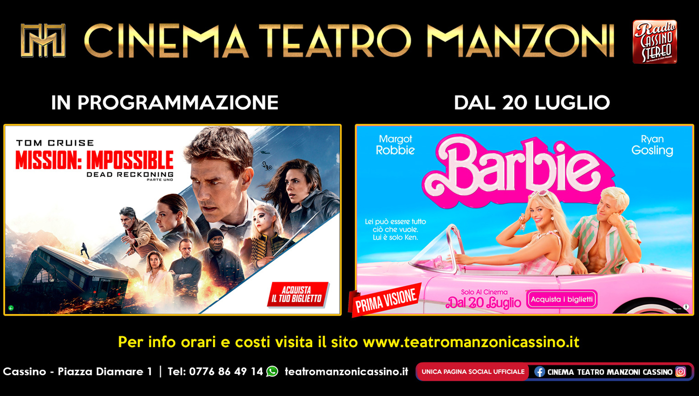 Cinema Teatro Manzoni di Cassino, con le ultime due proiezioni di oggi, mercoledì 19 luglio, cala il sipario su Mission Impossible e si apre giovedì 20 il magico mondo di Barbie, l’iconica bambola della Mattel che dagli anni ’60 non smette di essere un riferimento, per quanto tacciata, spesso, di essere un modello troppo antifemminista. Ma sempre adeguata ai tempi e agli stili di un mondo in continua evoluzione.