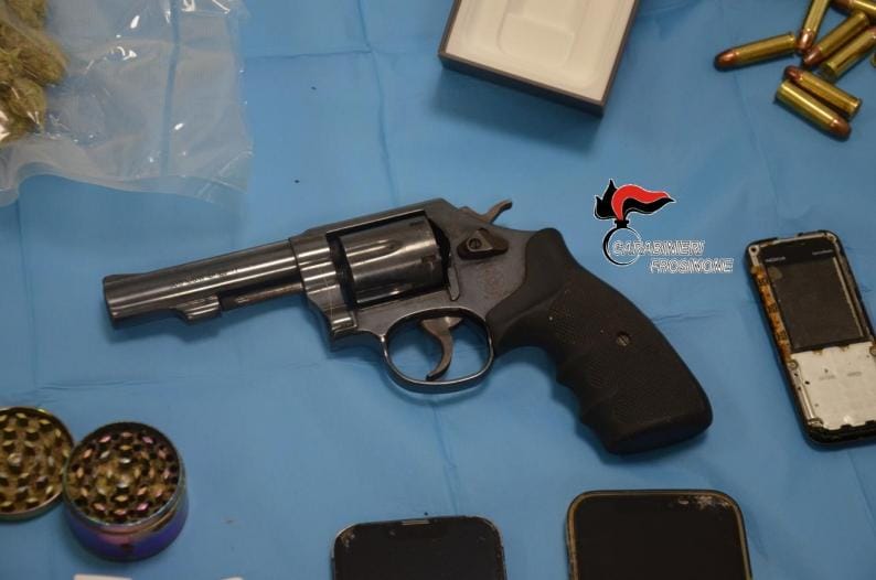 I Militari dopo prolungata attività di osservazione nei pressi dell’abitazione del giovane, gravato da numerosi precedenti per reati contro il patrimonio, la persona ed inerenti gli stupefacenti, facevano irruzione nell’appartamento, ed a seguito di perquisizione domiciliare rinvenivano un revolver “Smith & Wesson” cal.38 special, 100 cartucce cal.38, vari bossoli cal 38, 1,6 kg di stupefacente del tipo hashish ed 1 kg di stupefacente del tipo marijuana. Inoltre l’attività di ricerca consentiva di sequestrare la somma contante di euro 3.625, in banconote di vario taglio, ritenuta provento dell’attività di spaccio. Dagli accertamenti espletati sull’arma sottoposta a sequestro è emerso che la stessa è stata asportata nel settembre 2022 nel corso di un furto in abitazione perpetrato nel comune di Ceccano (FR).