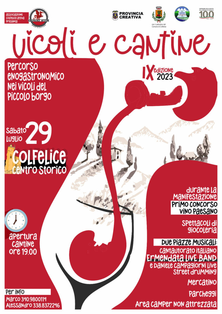 «Un’iniziativa di grande richiamo che abbiamo voluto promuovere anche quest’anno perché oramai nella tradizione e nella storia del nostro Comune. Vicoli e Cantine rappresenta un modo per ritrovarci tutti insieme in una serata di fine luglio a gustare le specialità enogastronomiche del posto, con la possibilità di godersi per qualche ora i luoghi più suggestivi di Colfelice, quei vicoli che nella vita frenetica di ogni giorno nessuno di noi si ferma mai a guardare» spiega Gabriele Iommi, Presidente dell’Associazione.