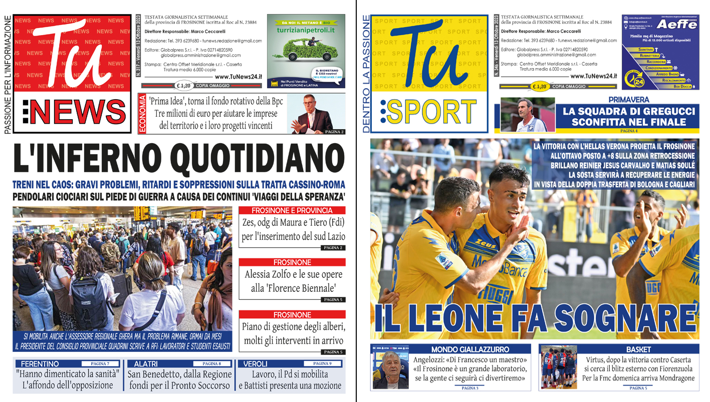 In distribuzione oggi e domani le nuove edizioni dei giornali free press della Ciociaria. “Tu News” con tanta attualità, cronaca, politica, inchiesta, cultura e spettacolo della provincia di Frosinone. E in più “Tu Sport”, dedicato al calcio, al basket, al volley, ai motori e a tutto il mondo dello sport ciociaro. Non perdete la vostra edizione cartacea reperibile nelle maggiori edicole o in bar, pasticcerie, pub, centri commerciali, palazzi istituzionali, negozi e hotel!