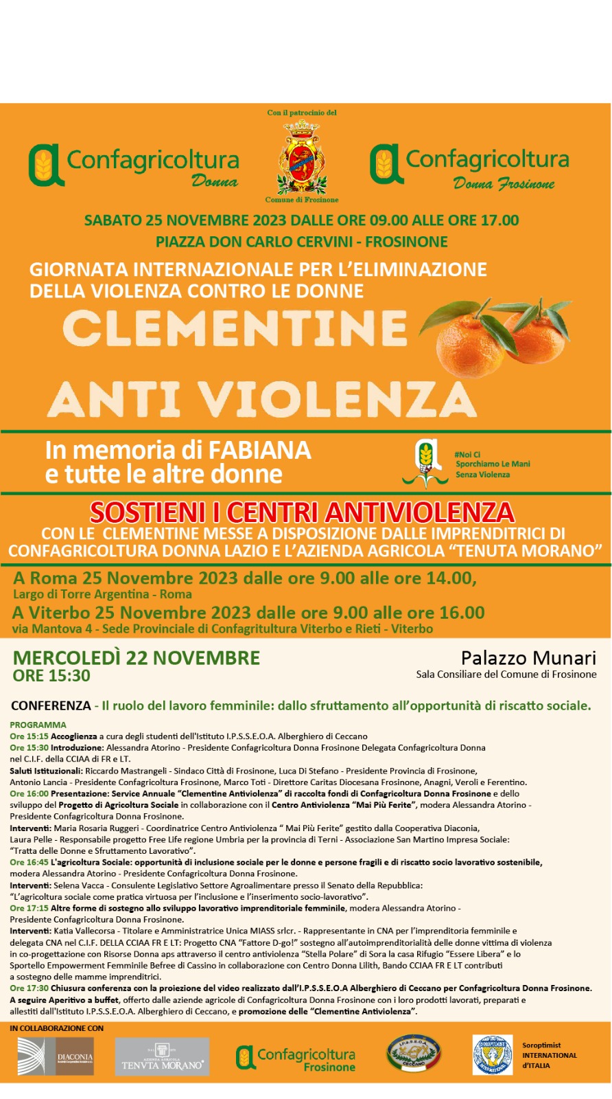 Saluti Istituzionali di Riccardo Mastrangeli, Sindaco di Frosinone; Luca Di Stefano, Presidente della Provincia; Antonio Lancia, Presidente Confagricoltura Frosinone; Marco Toti, Direttore Caritas Diocesana Frosinone, Anagni, Veroli e Ferentino. Alle 16 spazio alla presentazione del service Annuale “Clementine Antiviolenza”, raccolta fondi di Confagricoltura Donna Frosinone e sviluppo del progetto di agricoltura sociale in collaborazione con il Centro Antiviolenza “Mai Più Ferite”, modera Alessandra Atorino, Presidente Confagricoltura Donna Frosinone. Interventi di Maria Rosaria Ruggeri, Coordinatrice Centro Antiviolenza “Mai Più Ferite”; Laura Pelle, responsabile progetto Free Life regione Umbria per la provincia di Terni; Selena Vacca, Consulente Legislativo Settore Agroalimentare presso il Senato della Repubblica; Katia Vallecorsa, Rappresentante in CNA per l’imprenditoria femminile. La conferenza si concluderà con la proiezione del video realizzato dall’Alberghiero di Ceccano. A seguire aperitivo a buffet, offerto dalle aziende agricole di Confagricoltura Donna Frosinone con i prodotti lavorati, preparati e allestiti dall’Istituto Alberghiero di Ceccano, e promozione delle “Clementine Antiviolenza”. La vendita delle clementine, sabato 25 novembre, presso piazza don Carlo Cervini a Frosinone, dalle 9 alle 17, sosterrà infatti i centri antiviolenza.