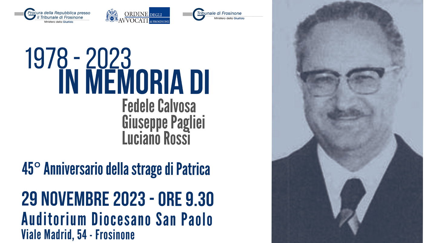 In occasione del 45° anniversario della ‘Strage di Patrica’, in cui furono barbaramente uccisi dai terroristi l’allora Procuratore della Repubblica di Frosinone, il Giudice Fedele Calvosa, il suo autista Luciano Rossi e l’agente della scorta Giuseppe Pagliei, si terrà una cerimonia di commemorazione alla presenza del Ministro dell’Interno, Matteo Piantedosi.