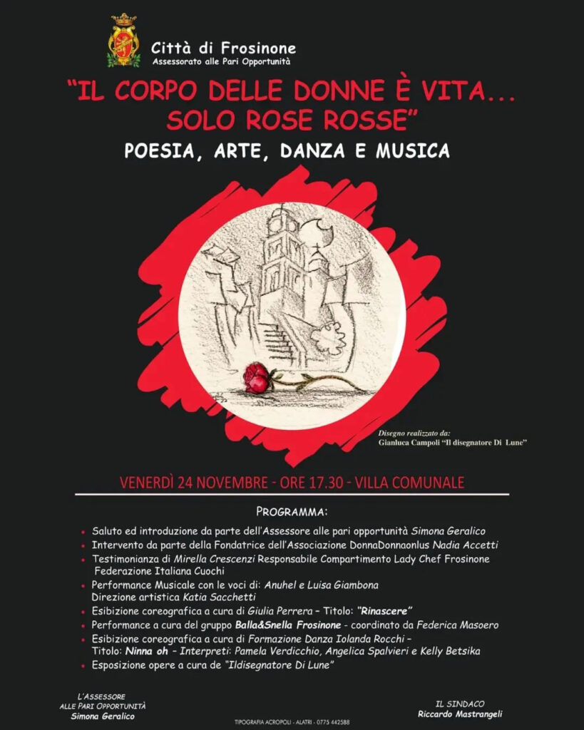 Venerdì 24 novembre, alle ore 17.30, la Villa comunale di Frosinone ospiterà l’evento dal titolo “Il corpo delle donne è vita… solo rose rosse”, nell’ambito degli eventi organizzati per la Giornata internazionale per l’eliminazione della violenza contro le donne.