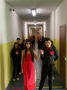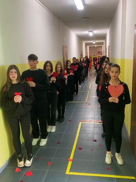 I cuori sono stati realizzati direttamente dai ragazzi con tessuto di cotone di colore rosso, che rappresentano Amore, Passione, Sangue versato delle donne. Tutti gli studenti erano vestiti di nero in segno di Rispetto, Uguaglianza e Lutto per tutte le donne vittime di violenza. A chiudere il Flash mob è stata una coppia di alunni che rappresentano la speranza del rispetto e dell’unione tra persone che condividono un futuro insieme.