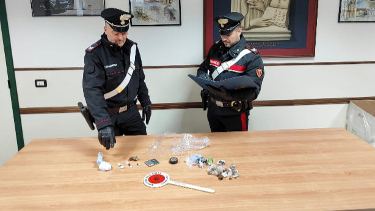Alla vista dei militari l’uomo si è mostrato in forte stato di agitazione, ragion per cui è stato sottoposto a perquisizione veicolare e personale, nel corso della quale, occultato nel vano centrale ove è posto il bracciolo, sulla sua persona ed in una borsa posta nel bagagliaio posteriore, sono stati rinvenuti circa 61 grammi di sostanza stupefacente del tipo cocaina, in parte divisa in dosi, circa 15 grammi di sostanza stupefacente del tipo hashish ed un bilancino di precisione. Successivamente l’atto è stato esteso al suo domicilio ove sono stati rinvenuti ulteriori 80 grammi circa di hashish e vario materiale per il confezionamento.