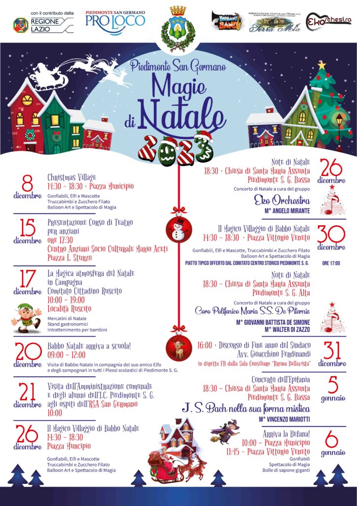 Il sindaco di Piedimonte San Germano, Gioacchino Ferdinandi e l’assessore alla Cultura, Ermelinda Costa, presentano il calendario degli eventi di Natale che prenderà avvio l’8 dicembre con la tradizionale accensione delle luminarie, pomeriggio arricchito dall’allestimento del Villaggio di Babbo Natale per i più piccoli mentre per le strade della città riecheggerà la musica della “Birband Band Street band” lungo un percorso musicale e gastronomico delle attività commerciali.