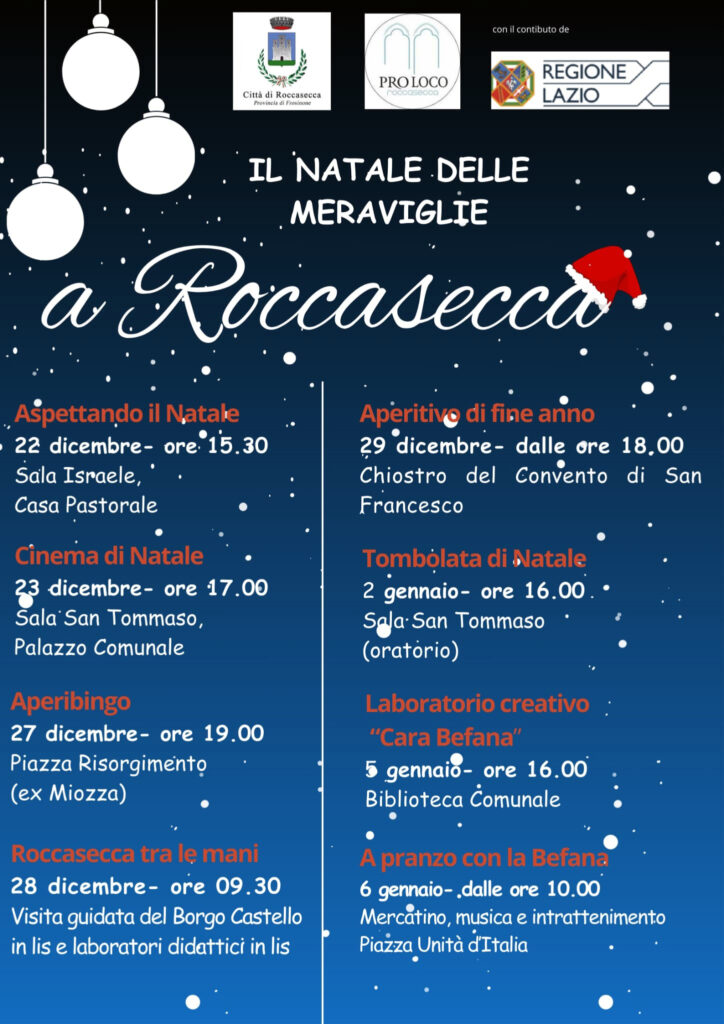 Intrattenimento, cinema, tombolate, convivialità, musica. Ce n’è per tutti i gusti nel cartellone delle manifestazioni natalizie che si svolgeranno a Roccasecca anche grazie alla Pro Loco.