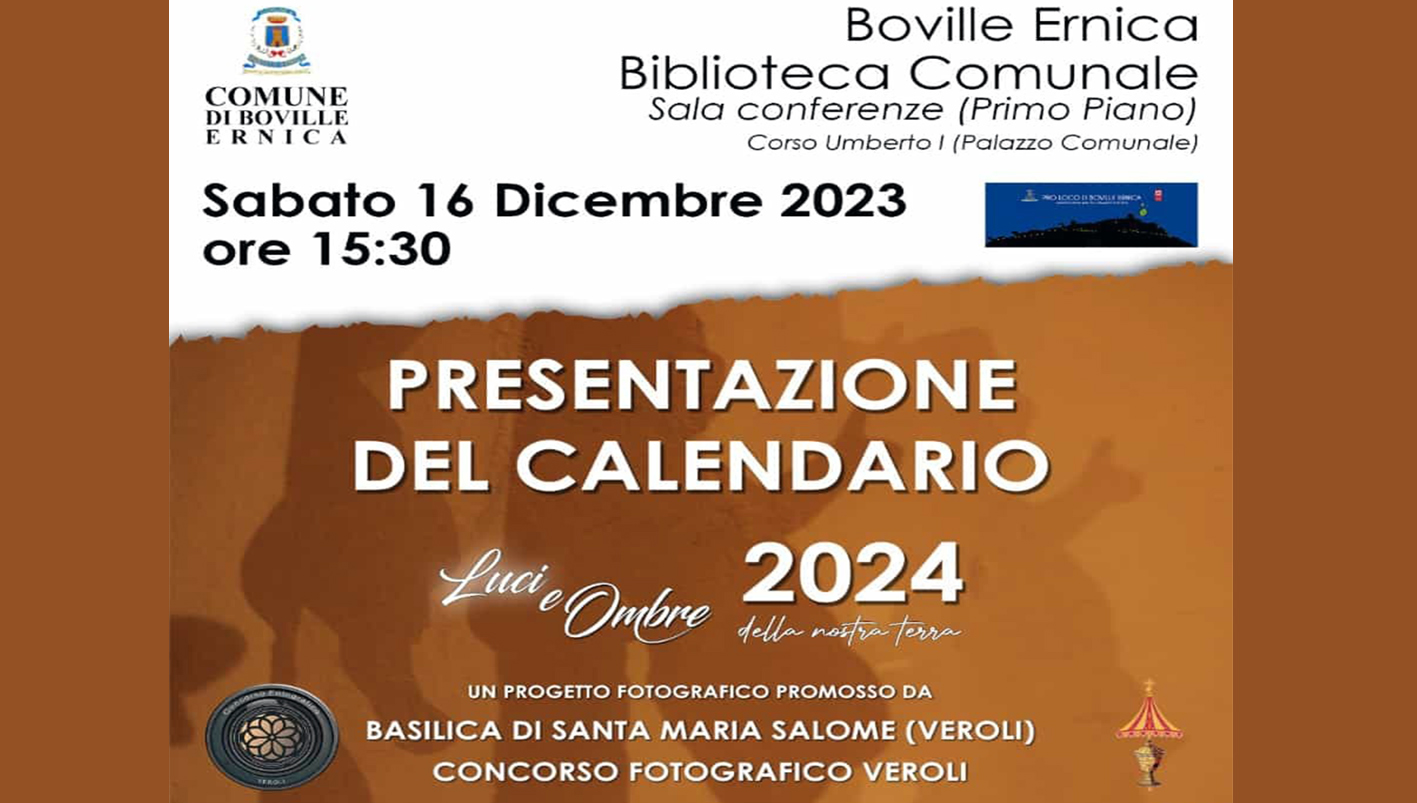 Ad arricchire il weekend ci sarà anche un altro appuntamento culturale. Sabato 16 dicembre, alle ore 15.30 presso la Sala Conferenze, al primo piano della Biblioteca comunale, verrà presentato il Calendario 2024 “Luci e Ombre della nostra terra”, un progetto fotografico promosso dalla Basilica di Santa Salome (Veroli) e il Concorso Fotografico Veroli. Un’occasione per scoprire la bellezza della nostra terra attraverso gli occhi degli artisti locali.