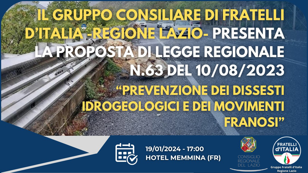 Si svolgerà venerdì 19 alle ore 17 presso l’hotel Memmina a Frosinone l’evento di presentazione della proposta di legge regionale n. 63 del 10/08/2023 a firma Daniele Maura da parte del Gruppo Consiliare di Fratelli d’Italia – Regione Lazio – riguardante la “prevenzione dei dissesti idrogeologici e dei movimenti franosi”.