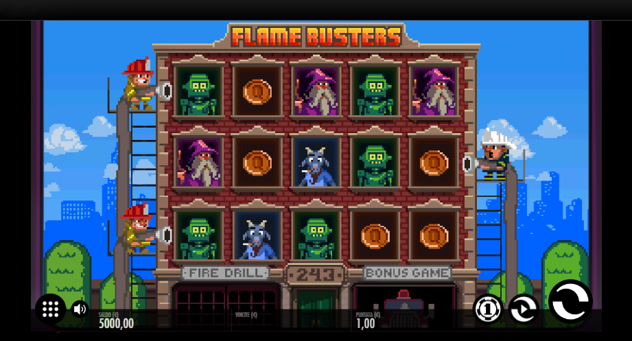 Nella slot machine Flame Busters, ci troviamo in una casa in fiamme ed è importante cercare di arrivare il più in alto possibile nella casa.