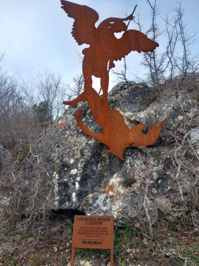 Il cammino, alla portata di tutti pur con un dislivello attivo di quasi 700 metri, parte come detto dall’abitato di Patrica ed è scandito dall’incontro con 12 statue che si succedono fino all’imponente croce di vetta. Le statue, realizzate in corten e posizionate nei punti più panoramici, raffigurano i personaggi principali dei vari gironi danteschi, come Beatrice, Lucifero, Virgilio, Barbarossa, Manfredi, Traiano ecc.