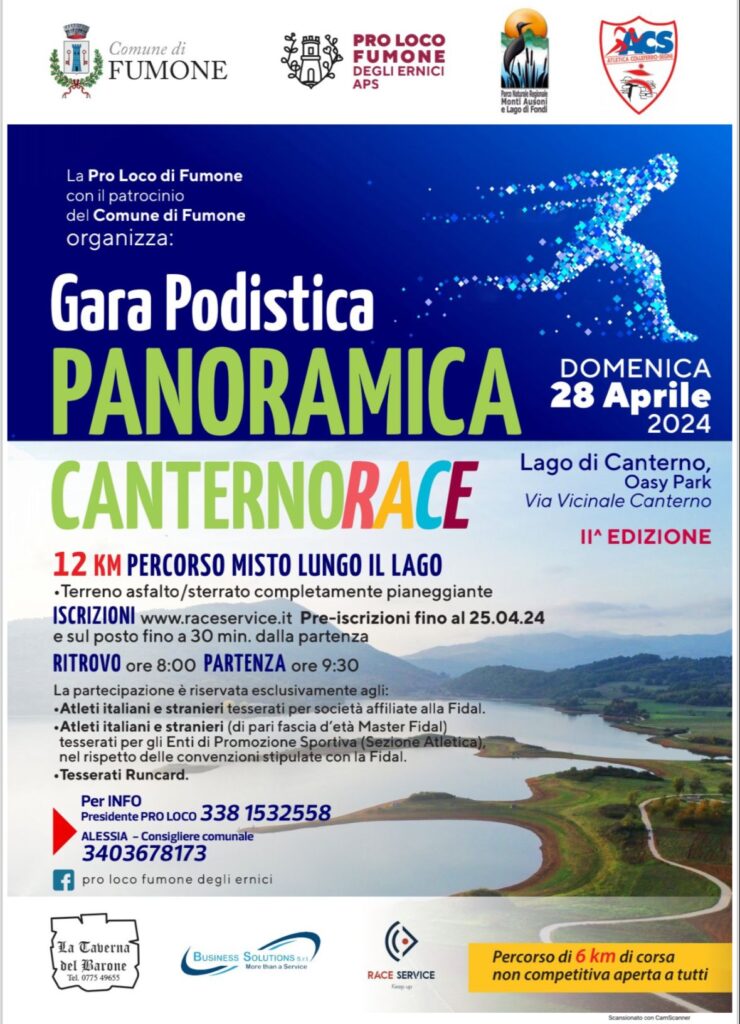 Si chiama “CanternoRace” ed è la gara podistica-panoramica che, giunta alla sua seconda edizione, è in programma domenica 28 aprile sulla pista del Lago di Canterno. Due le competizioni in programma: una di natura competitiva (12 km di percorso misto lungo il lago su terreno asfalto/sterrato completamente pianeggiante) ed un’altra di carattere non competitivo inserita da quest’anno (in tale caso si tratta di un tracciato di 6 km sullo stesso sentiero). Quest’ultima è aperta a tutti, mentre la partecipazione alla prima è riservata esclusivamente ad atleti italiani e stranieri tesserati per società affiliate alla Fidal; atleti italiani e stranieri (di pari fascia d’età Master Fidal) tesserati per gli Enti di Promozione Sportiva – Sezione Atletica – nel rispetto delle convenzioni stipulate con la Fidal; Tesserati Runcard.