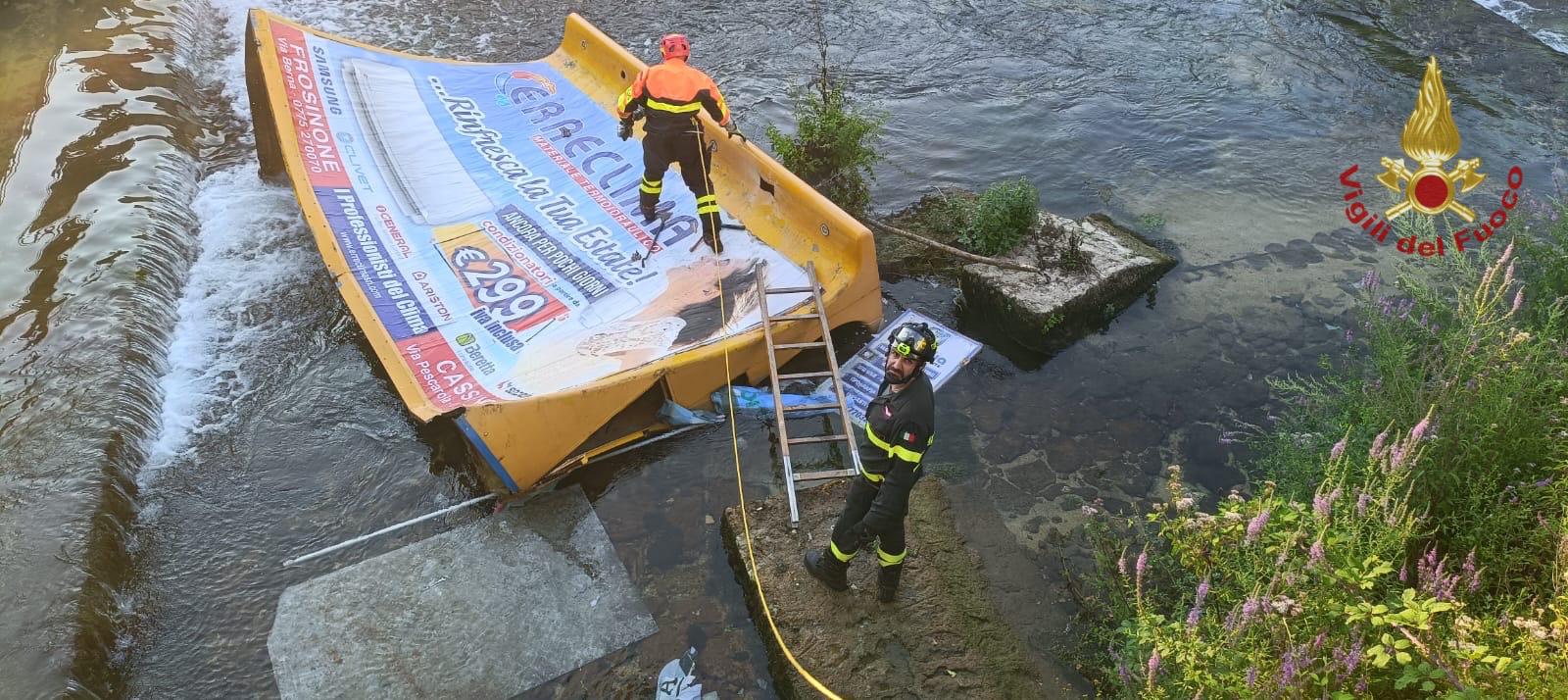 Solo il muro e Il guard-rail hanno impedito che il mezzo pesante finisse nel fiume ma a causa del forte impatto la vela pubblicitaria si è staccata ed è finita nel corso d’acqua.