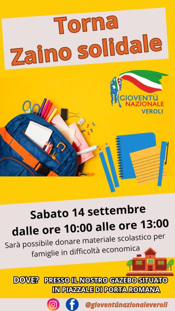“La solidarietà e la generosità sono valori fondamentali che caratterizzano la nostra comunità e in particolare Gioventù Nazionale Veroli che negli anni ha dimostrato quanto sia importante essere solidali con chi è meno fortunato. Con l’iniziativa denominata “zaino solidale” Gioventù nazionale Veroli da anni raccoglie materiale scolastico per aiutare le famiglie in difficoltà a preparare i propri figli al ritorno a scuola”.