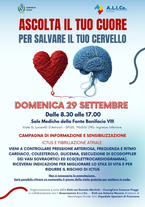 Tutto pronto a Fiuggi per la Campagna di informazione e sensibilizzazione su ictus e fibrillazione atriale. L’iniziativa si svolgerà domenica prossima, 29 settembre, dalle 8.30 alle 17 presso le Sale Mediche della Fonte Bonifacio VIII.