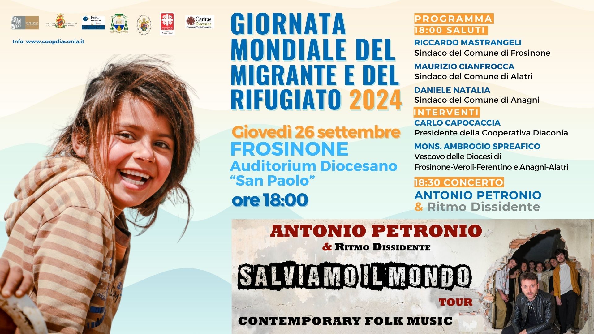 In occasione della 110° Giornata Mondiale del Migrante e del Rifugiato, giovedì 26 settembre 2024 a partire dalle ore 18:00  si terrà il concerto gratuito di Antonio Petronio e dei “Ritmo Dissidente” presso l’Auditorium diocesano San Paolo di Frosinone.Il cantautore Antonio Petronio e il gruppo del basso Lazio “Ritmo Dissidente” sono noti per la loro proposta di musica contemporary-folk che nasce dalla contaminazione di culture diverse. Con canzoni dal forte impatto sociale, in giro per tutta Italia hanno dato vita al tour “Salviamo il mondo”.