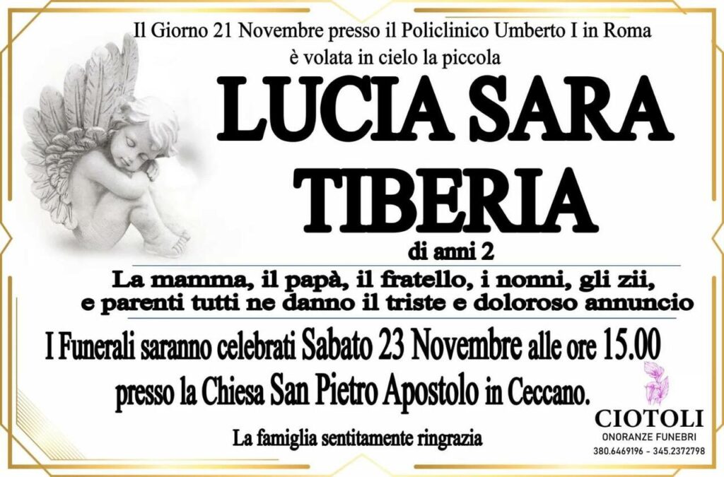 Lucia Sara Tiberia, di Ceccano, è volata in cielo nella serata di ieri, venerdì 21 novembre, mentre era ricoverata presso il Policlinico Umberto I di Roma dove stava lottando contro alcuni gravi problemi che la perseguitavano fin dalla nascita. Accanto a lei, piccolo angelo, distrutti dal dolore, la mamma, il papà, il fratello, i nonni e tutti gli altri parenti che in questa sua breve, troppo breve parentesi terrena l’hanno circondata di un amore immenso.