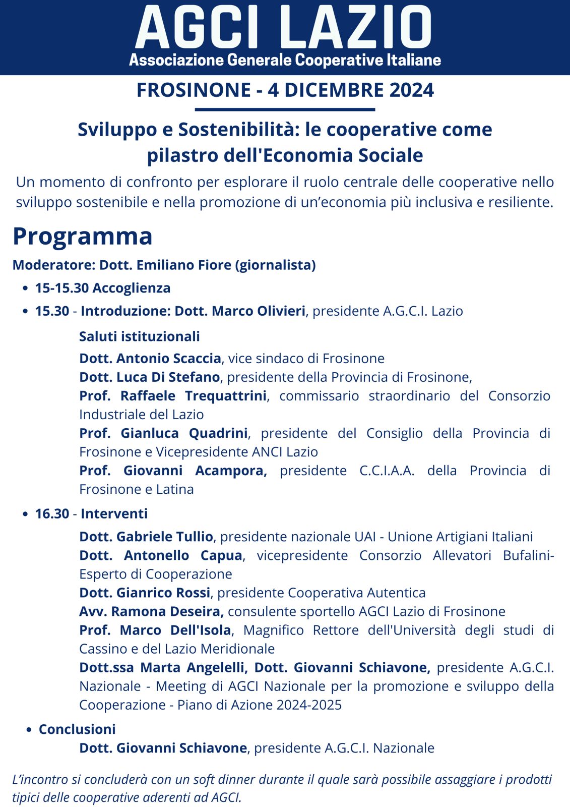 Il programma del 4 dicembre prevede: alle 15.30 l’introduzione di Marco Olivieri, presidente AGCI Lazio. Seguiranno i saluti istituzionali di Antonio Scaccia, vice sindaco di Frosinone; Luca Di Stefano, presidente della Provincia di Frosinone; Raffaele Trequattrini, commissario straordinario del Consorzio Industriale del Lazio; Gianluca Quadrini, presidente del Consiglio Provinciale di Frosinone e vice presidente ANCI Lazio; Giovanni Acampora, presidente CCIAA Camera di Commercio della Provincia di Frosinone e Latina
