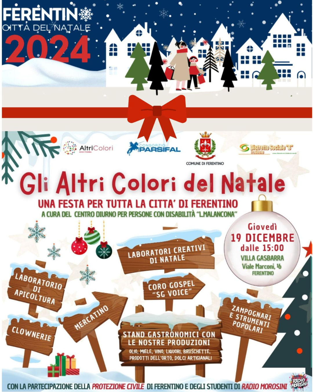 Il ricco programma dell’evento “𝐆𝐥𝐢 𝐀𝐥𝐭𝐫𝐢 𝐂𝐨𝐥𝐨𝐫𝐢 𝐝𝐞𝐥 𝐍𝐚𝐭𝐚𝐥𝐞” offrirà una serie di proposte che consentiranno ai partecipanti di conoscere parte del lavoro quotidianamente svolto dalle persone che frequentano il Centro, e di condividerne i frutti negli stand che saranno allestiti per ambiti di intervento.