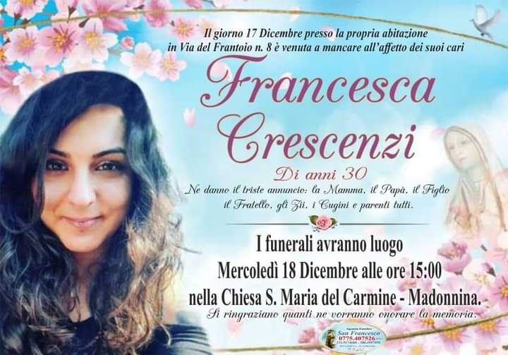 Si svolgeranno domani (mercoledì 18 dicembre) alle 15 presso la Chiesa Santa Maria del Carmine – Madonnina, i funerali di Francesca Crescenzi, la ragazza di 30 anni trovata morta questa mattina intorno alle 5.30 nel giardino della sua abitazione, in via del Frantoio a Tecchiena di Alatri.