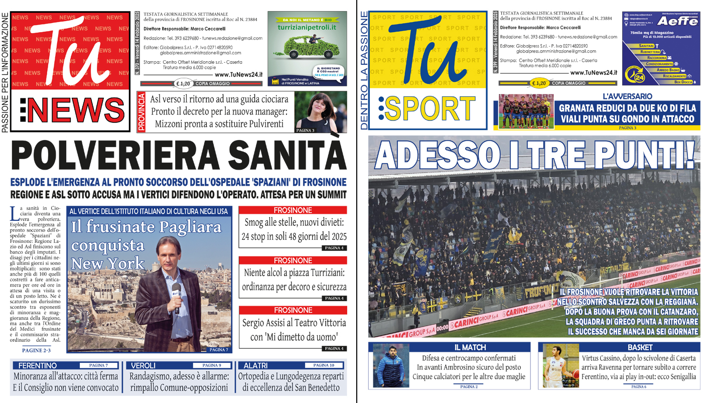 In distribuzione oggi e domani le nuove edizioni dei giornali free press della Ciociaria. “Tu News” con tanta attualità, cronaca, politica, inchiesta, cultura e spettacolo della provincia di Frosinone. E in più “Tu Sport”, dedicato al calcio, al basket, al volley, ai motori e a tutto il mondo dello sport ciociaro. Non perdete la vostra edizione cartacea reperibile nelle maggiori edicole o in bar, pasticcerie, pub, centri commerciali, palazzi istituzionali, negozi e hotel!