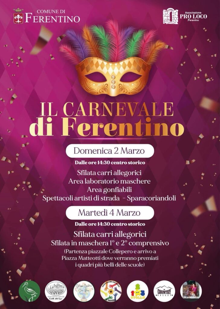 Vi invitiamo quindi a non mancare a questa grande celebrazione della cultura e delle tradizioni di Ferentino, un Carnevale che promette di essere ancora più speciale grazie alla partecipazione e all’entusiasmo di tutti!