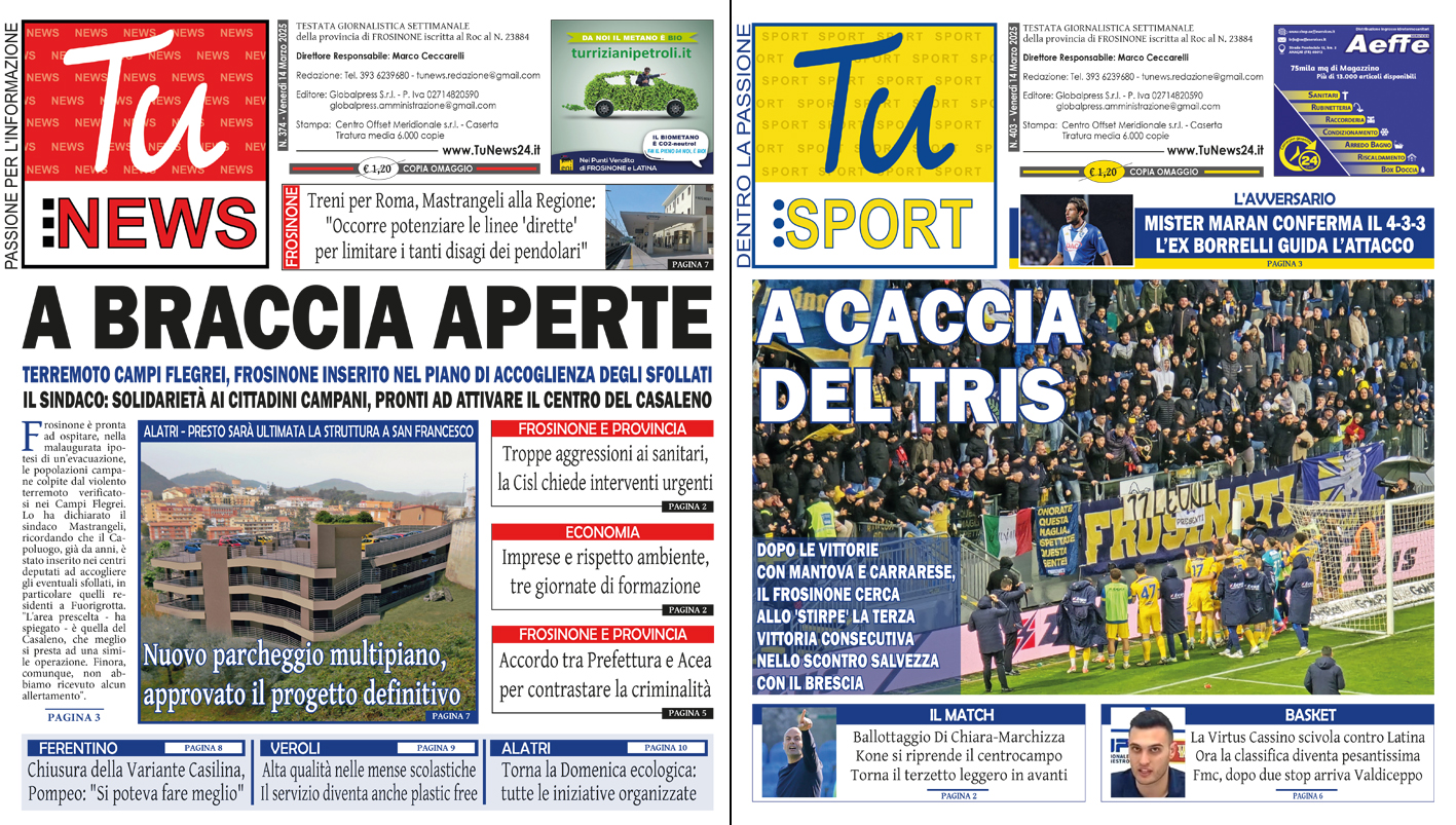 In distribuzione oggi e domani le nuove edizioni dei giornali free press della Ciociaria. “Tu News” con tanta attualità, cronaca, politica, inchiesta, cultura e spettacolo della provincia di Frosinone. E in più “Tu Sport”, dedicato al calcio, al basket, al volley, ai motori e a tutto il mondo dello sport ciociaro. Non perdete la vostra edizione cartacea reperibile nelle maggiori edicole o in bar, pasticcerie, pub, centri commerciali, palazzi istituzionali, negozi e hotel!