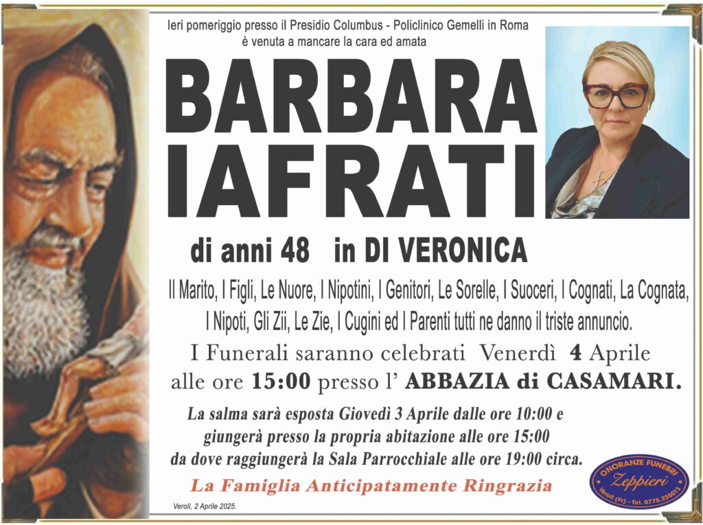 I funerali di Barbara Iafrati si svolgeranno domani (venerdì 4 aprile) alle 15 presso l’Abbazia di Casamari. La salma sarà esposta da stamattina (giovedì 3 aprile) alle 10 e giungerà presso la propria abitazione alle 15 da dove raggiungerà la sala parrocchiale della contrada alle 19 circa.