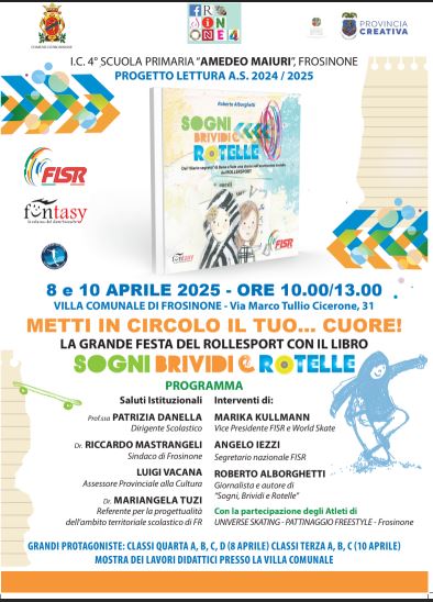 Presso la Villa Comunale del Capoluogo, dalle 10 alle 13 sarà la volta delle classi quarta sezioni A.B.C.D (giovedì 10, invece, negli stessi orari toccherà alle classi terze sezioni A.B.C.) gli alunni delle classi quarte e terze intervisteranno l’autore del libro “Sogni brividi e rotelle”, scritto dal giornalista Roberto Alborghetti, e mostreranno i lavori prodotti. Saranno presenti autorità locali e della FISR (Federazione Italiana Sport Rotellistici).