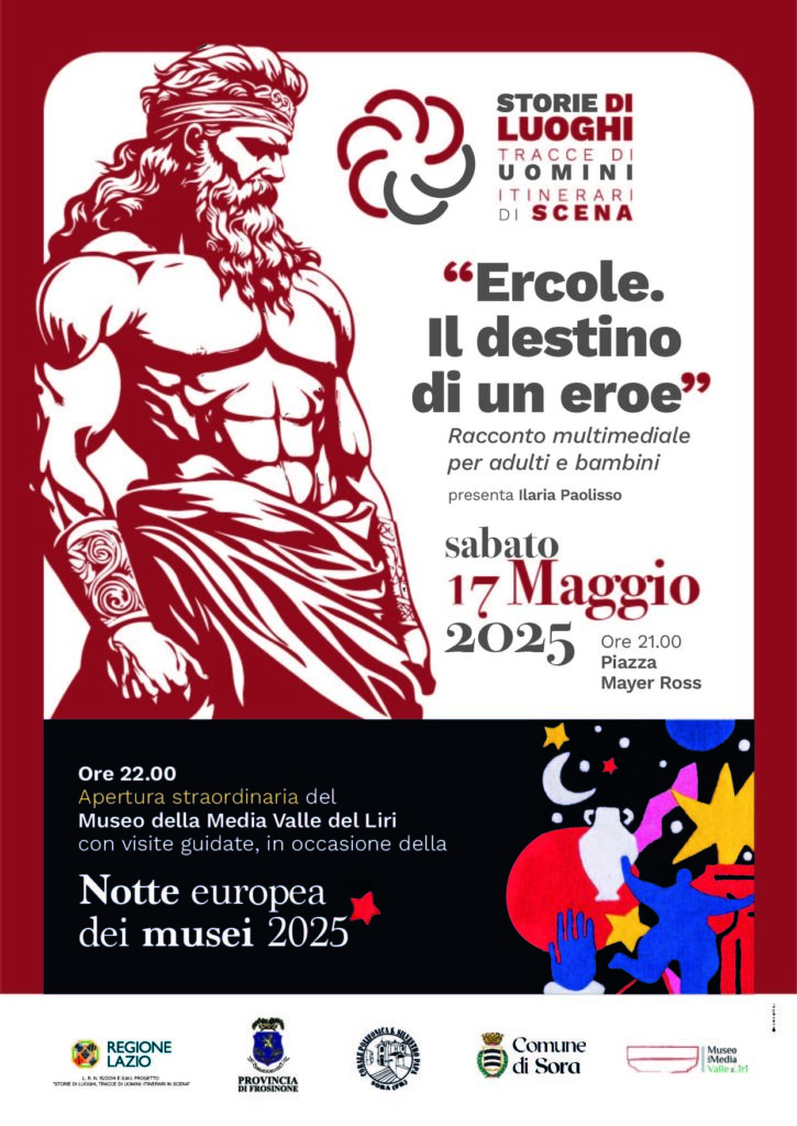 • alle ore 21.00, in Piazza Mayer Ross, sarà presentato lo spettacolo multimediale “Ercole. Il destino di un eroe”, all’interno della rassegna “Storie di luoghi, tracce di uomini – Itinerari in scena”;