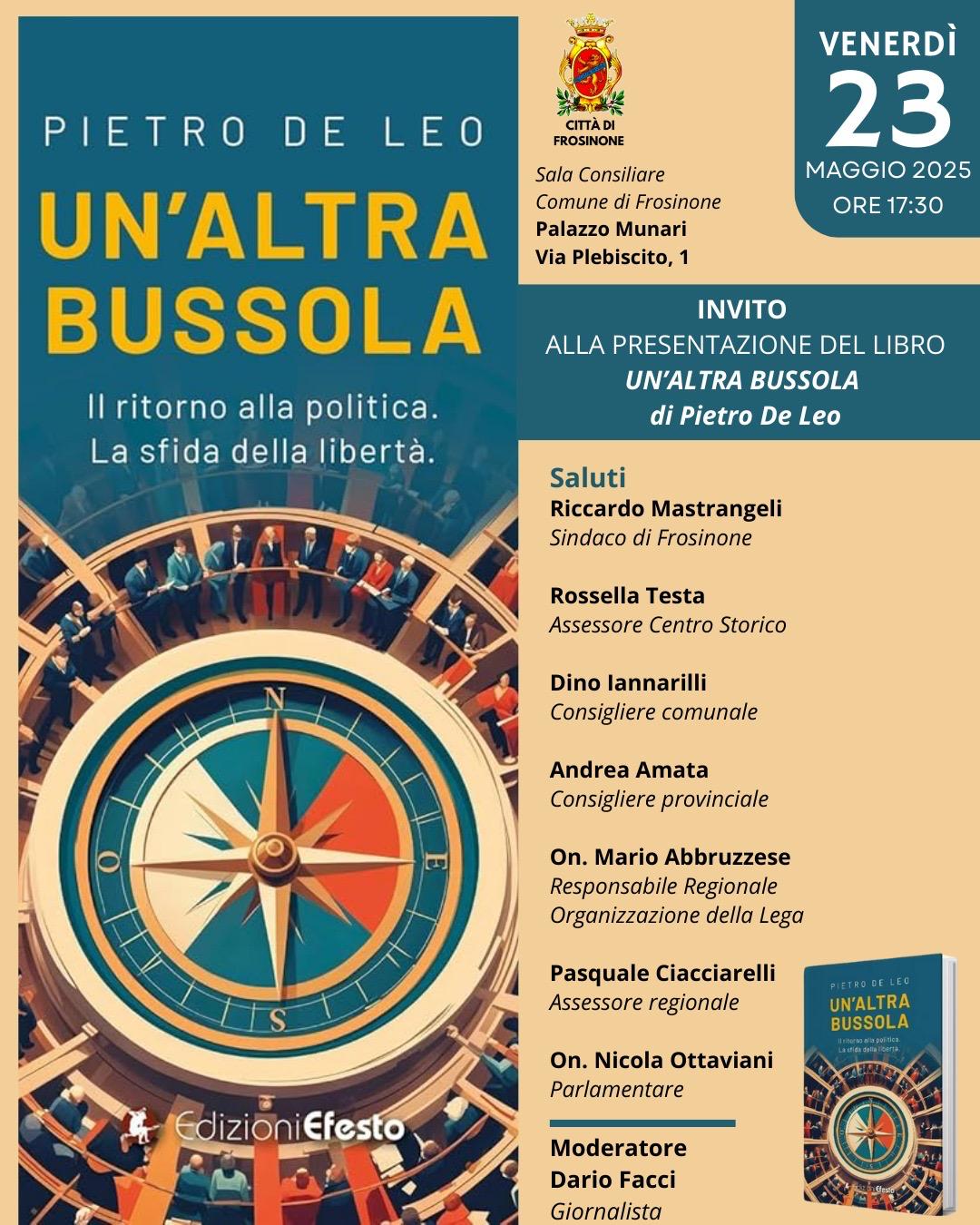 Oggi, venerdì 23 maggio, si svolgerà in Comune la presentazione del libro “Un’altra bussola. Il ritorno alla politica. La sfida della libertà” del giornalista e scrittore Pietro De Leo.