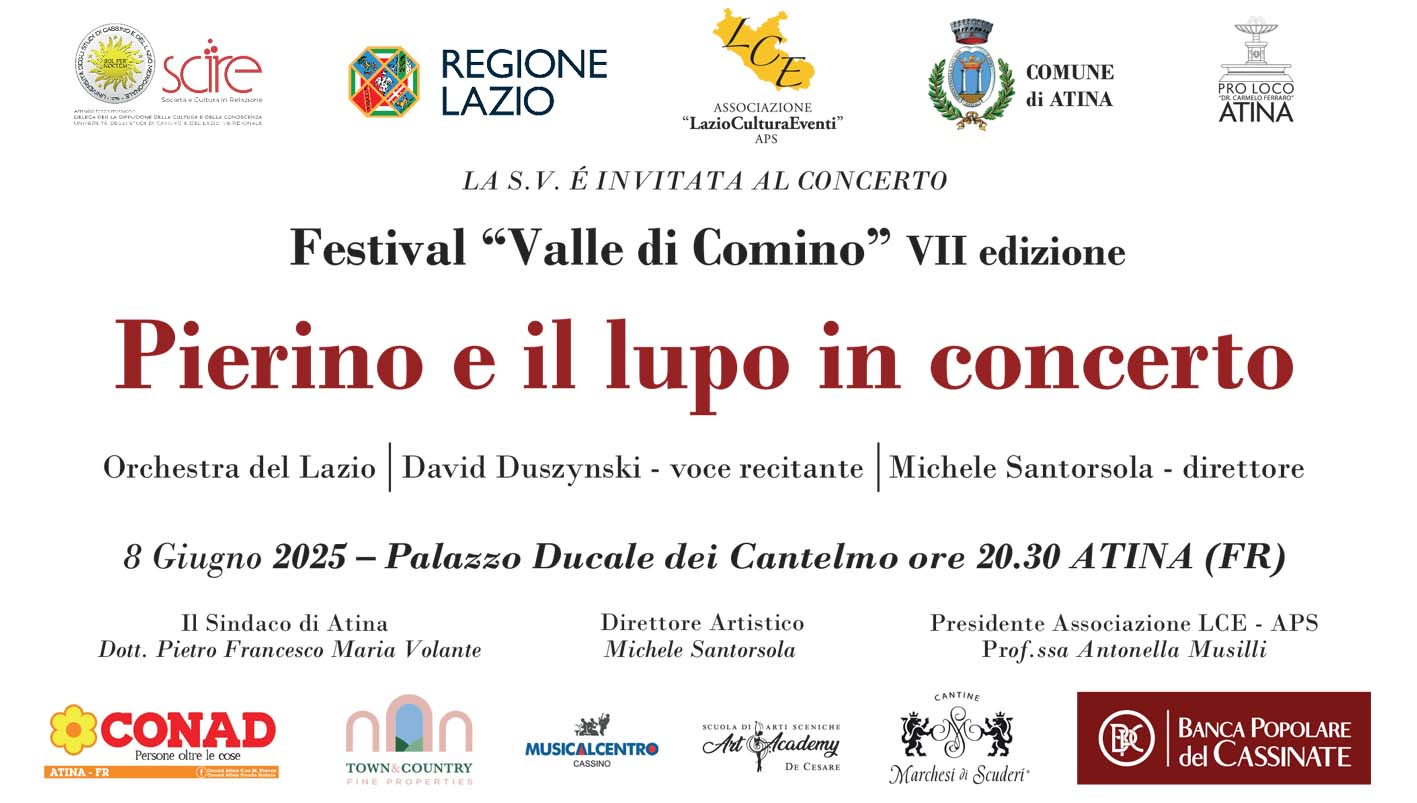 Si terrà domenica 8 giugno, alle 20.30, ad Atina, presso il Palazzo Ducale Dei Cantelmo, l’ultimo appuntamento della VII edizione del Festival “Valle Di Comino” con un evento imperdibile: “Pierino e il lupo”, Protagonisti l’Orchestra del Lazio, la voce recitante di David Duszynski e il direttore Michele Santorsola. Il Festival è realizzato con il contributo di Banca Popolare del Cassinate.
