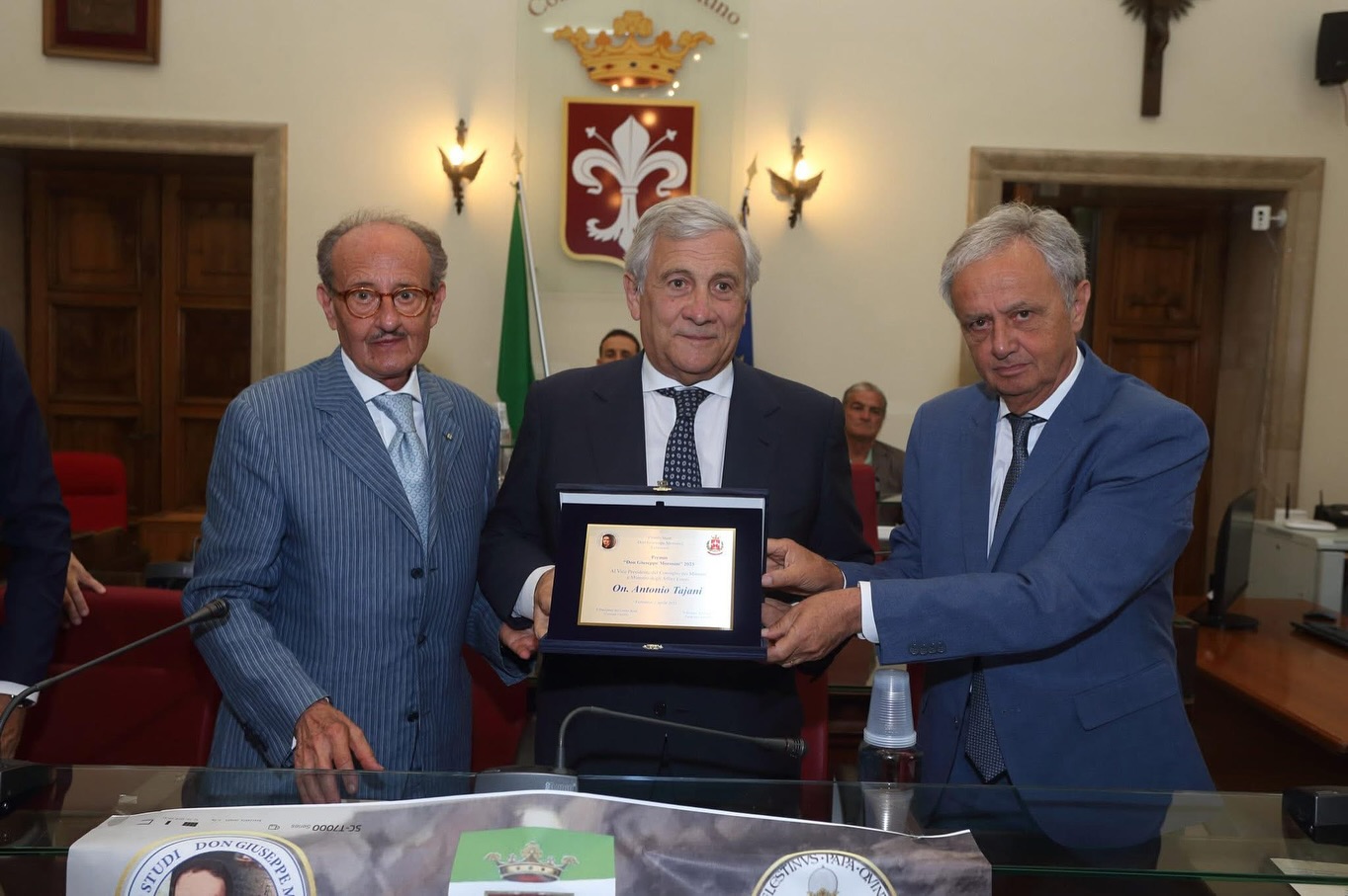 Si è svolta lo scorso 9 luglio 2025 nella sala consiliare del Comune di Ferentino la cerimonia di consegna dei premi “Don Giuseppe Morosini” e “Celestino V” conferiti dal Centro Studi Don Giuseppe Morosini e Accademia Celestino V all’On. Antonio Tajani Ministro degli Esteri e Vicepresidente del Consiglio dei Ministri, presso la sala consiliare del Comune di Ferentino.